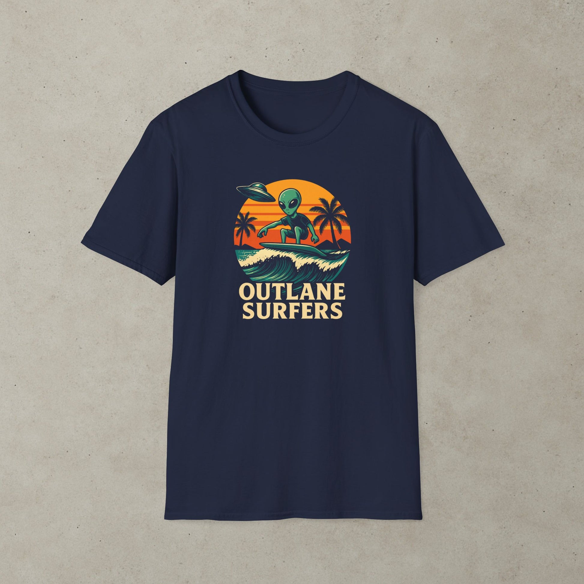 A crisp, colourful blast of pinball energy meets alien surf weirdness. This tee takes the classic outlane drain — that brutal, helpless drop — and turns it into an intergalactic surf scene.